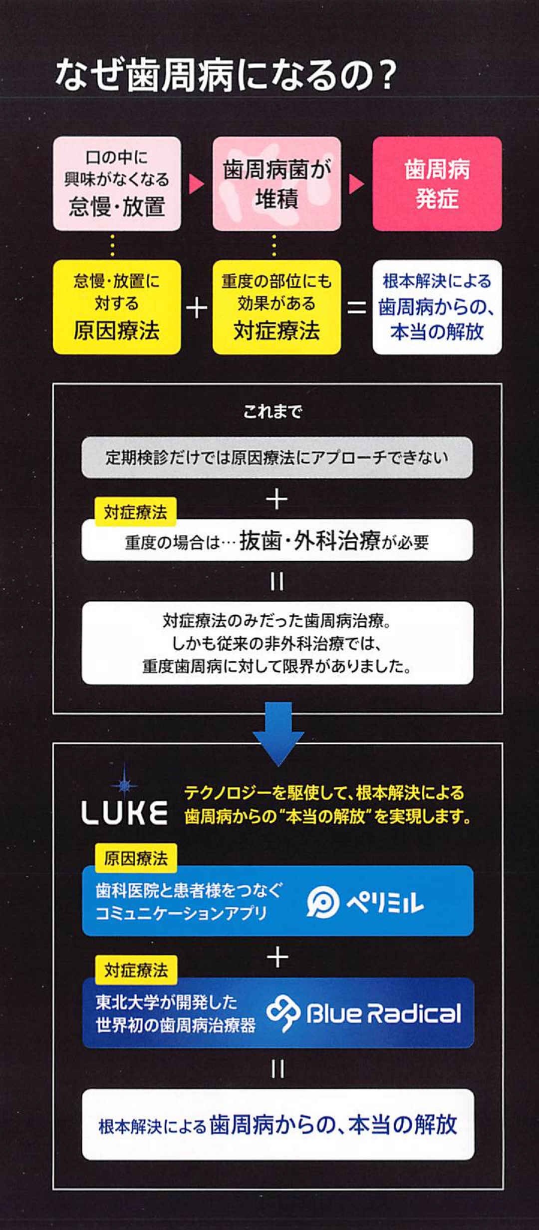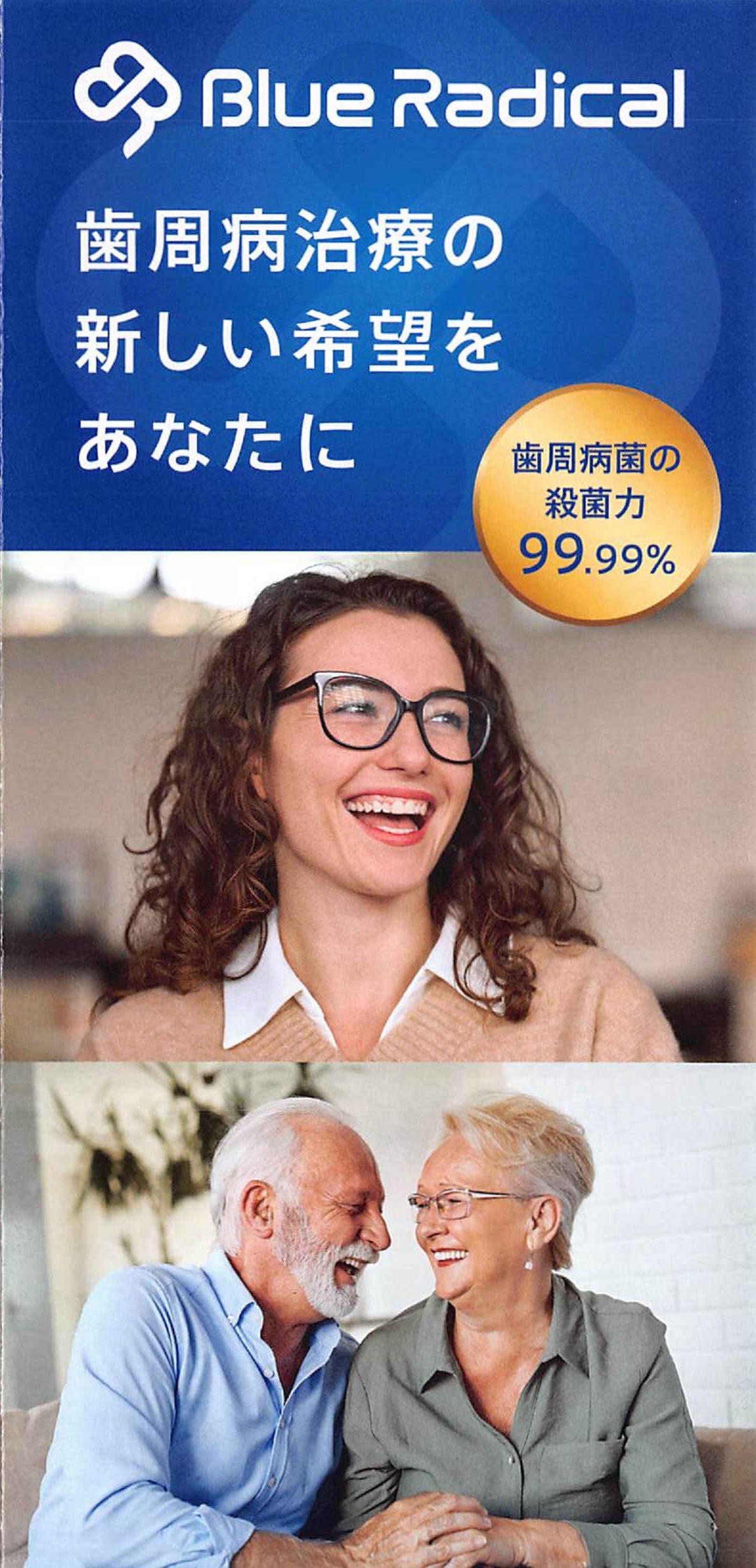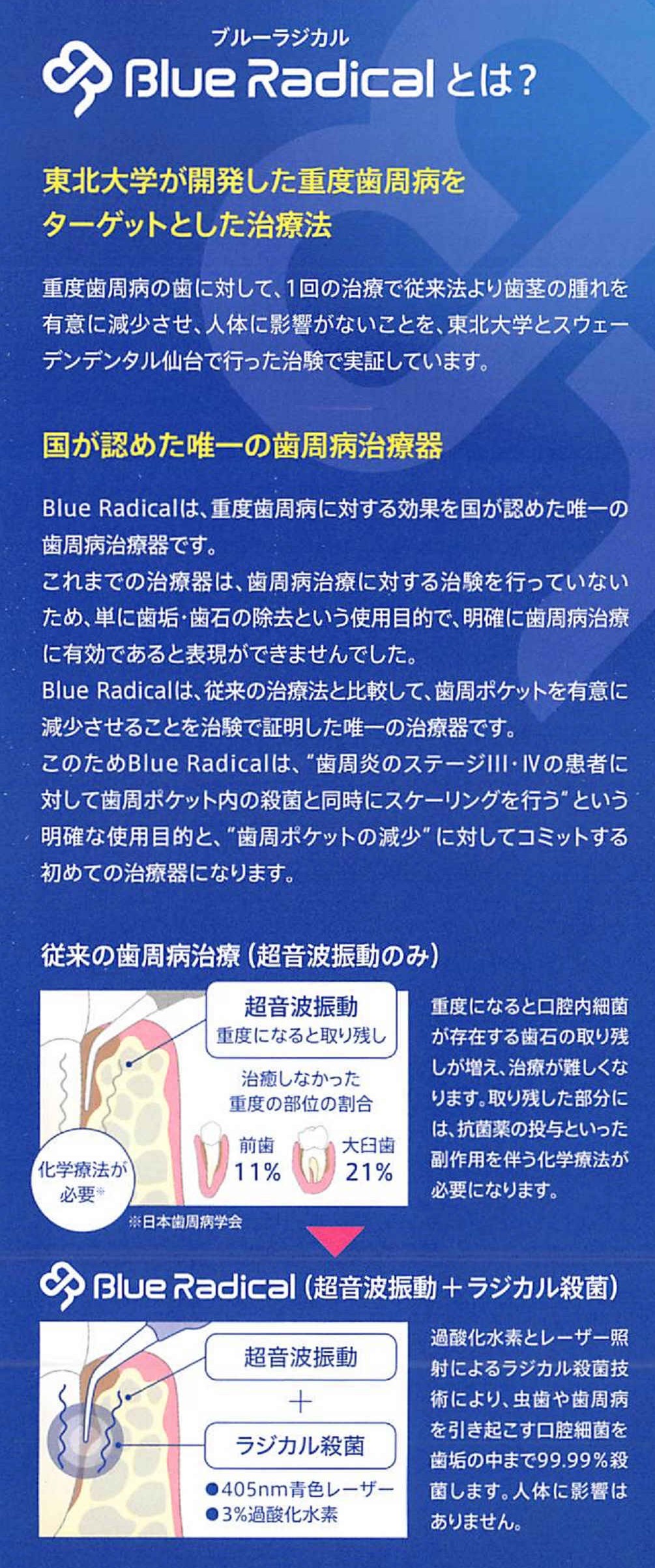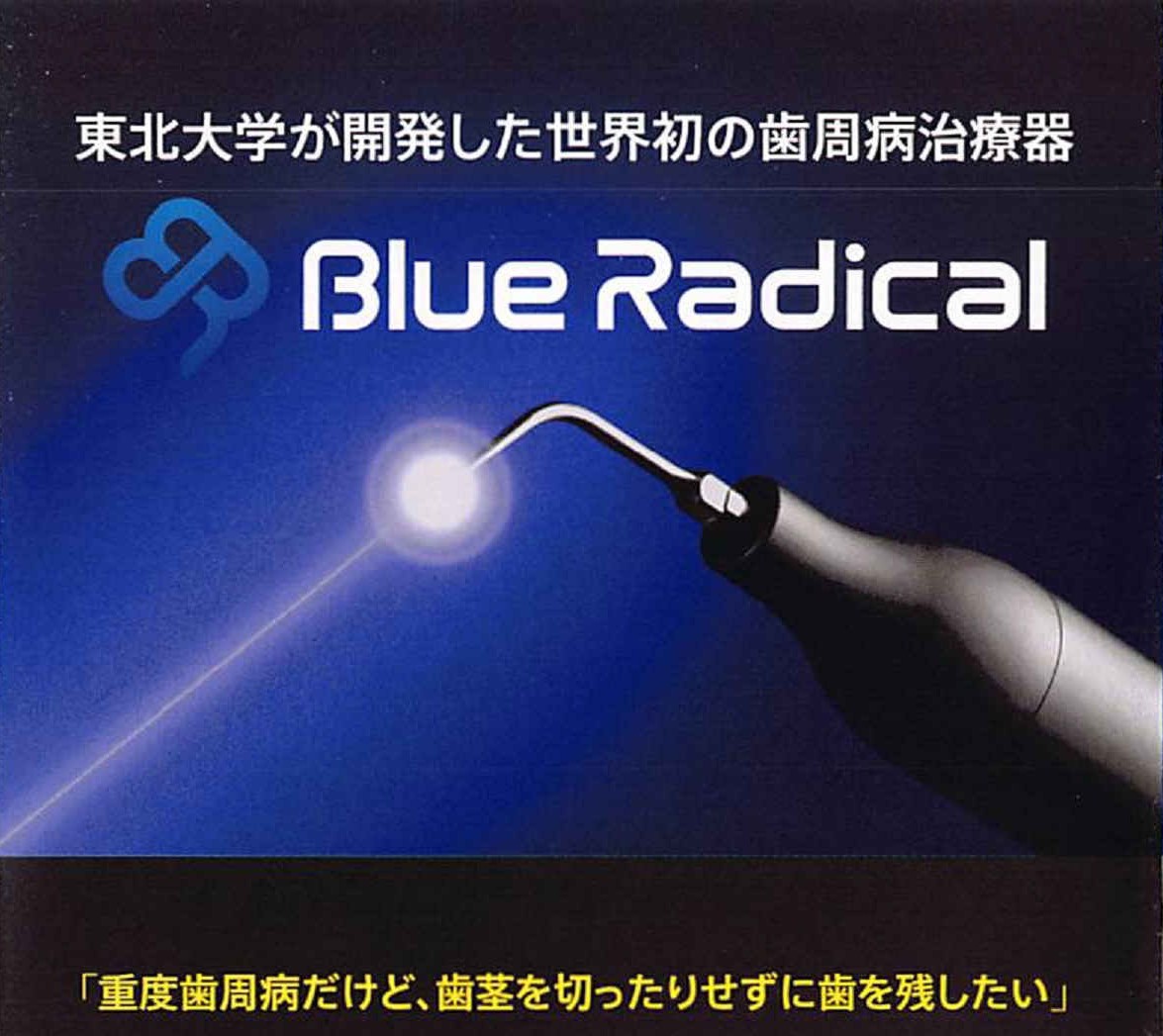 ブルーラジカル導入しました。 私、歯周病専門医。 中等度~重度歯周病の患者さん、歯周病の基本治療が終了した後にどうしても改善しない部位の歯は、 歯周外科処置が必要になります。 そんな患者さんに朗報が… 日本で初めて認可された歯周病治療用医療機器を導入しました。 これで、歯周外科が必要な患者さんが減ると嬉しいですね。 有名な歯周病専門医の先生方も導入され、評判がいいので導入してみました。 自費治療となります。